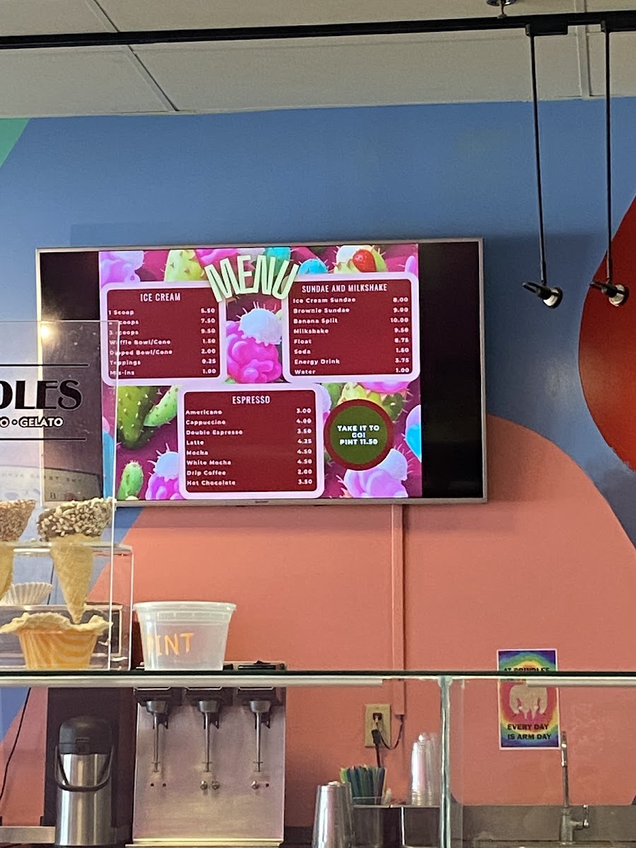 The menu at Brindles Ice Creams is centered on a diverse selection of frozen desserts, featuring a range of ice cream, gelato, and sorbet options. Each category offers a variety of flavors crafted in-house, providing customers with multiple choices to suit different taste preferences.